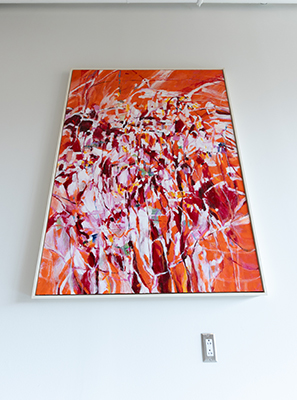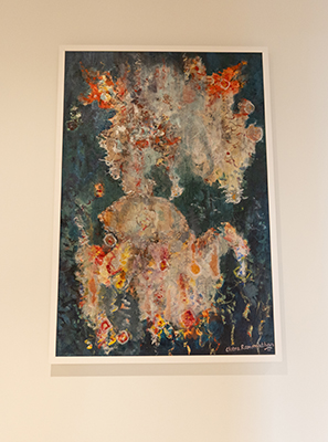 Ramanathan described how she created her frequent large-scale paintings: “In Pulsating Rhythms, I used both basic as well as heavy-body acrylic colors along with textural materials incorporated into the paints. On this large surface, I compare the panorama of undulating rhythmic movements and sound of ocean waves inspired by the Atlantic Ocean situated across from my former coastal home, to the aural experience of the rhythm in music, as a connection between my visual and mental interpretation. The piece titled Manifestation, on the other hand, is entirely conceptual. Employing a bold color palette and collaged mixed media, the subject is an abstract manifestation of a mythical entity, which I leave open to viewer impression.”